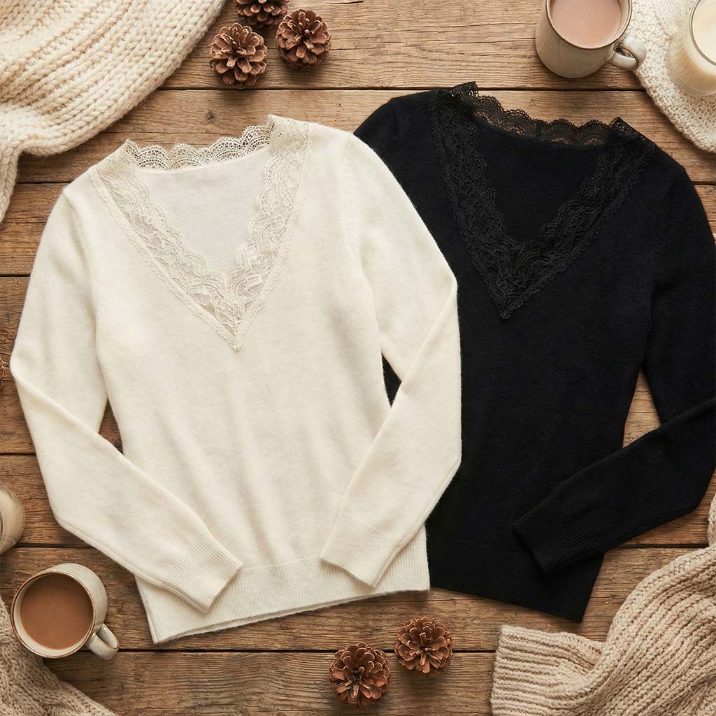 גופיה אנגורה לנשים שרוול ארוך + תחרה בצבעי שחור ושנהב במידות S עד 4XL