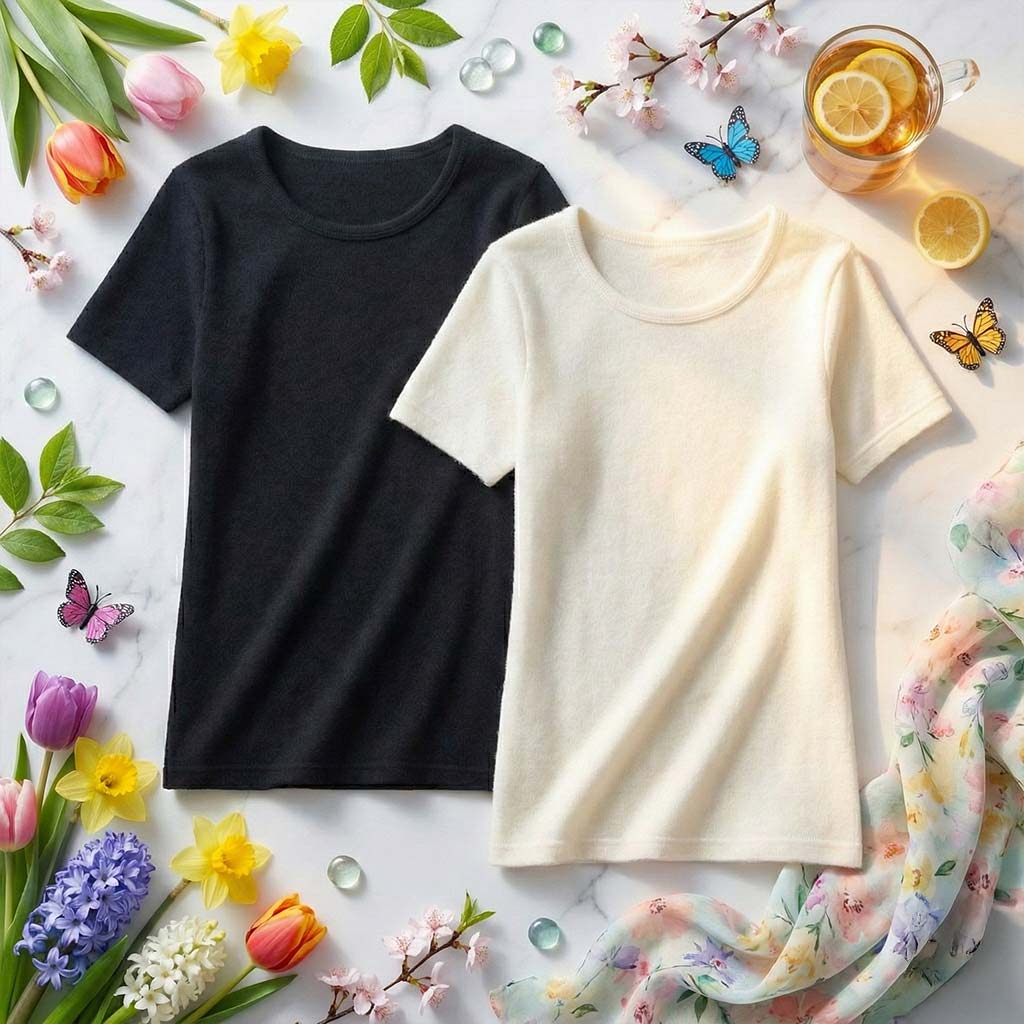 גופיה אנגורה לנשים שרוול קצר גזרת צוואר מעוגלת-U או בצורת V בצבעי שחור ושנהב במידות S עד 4XL